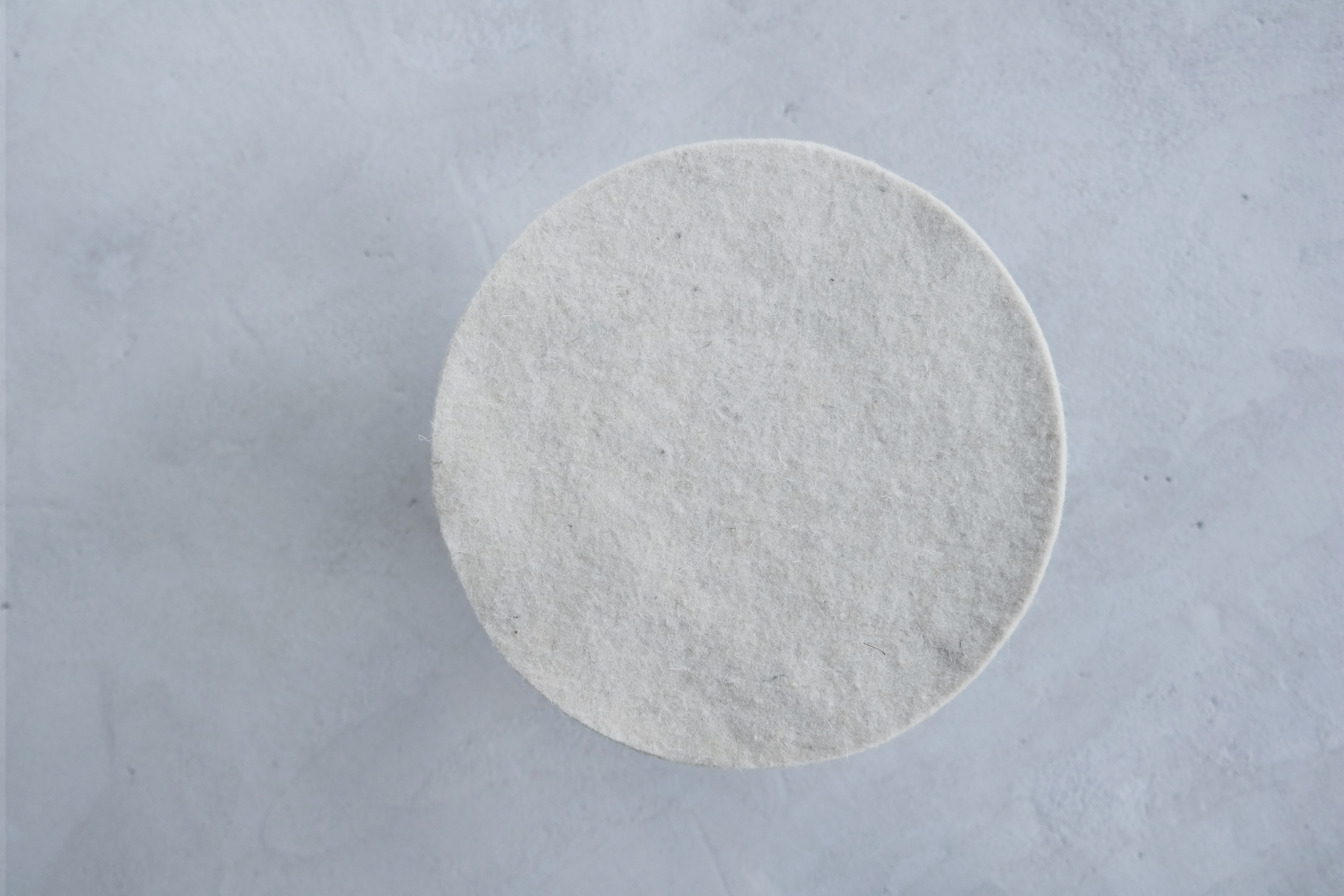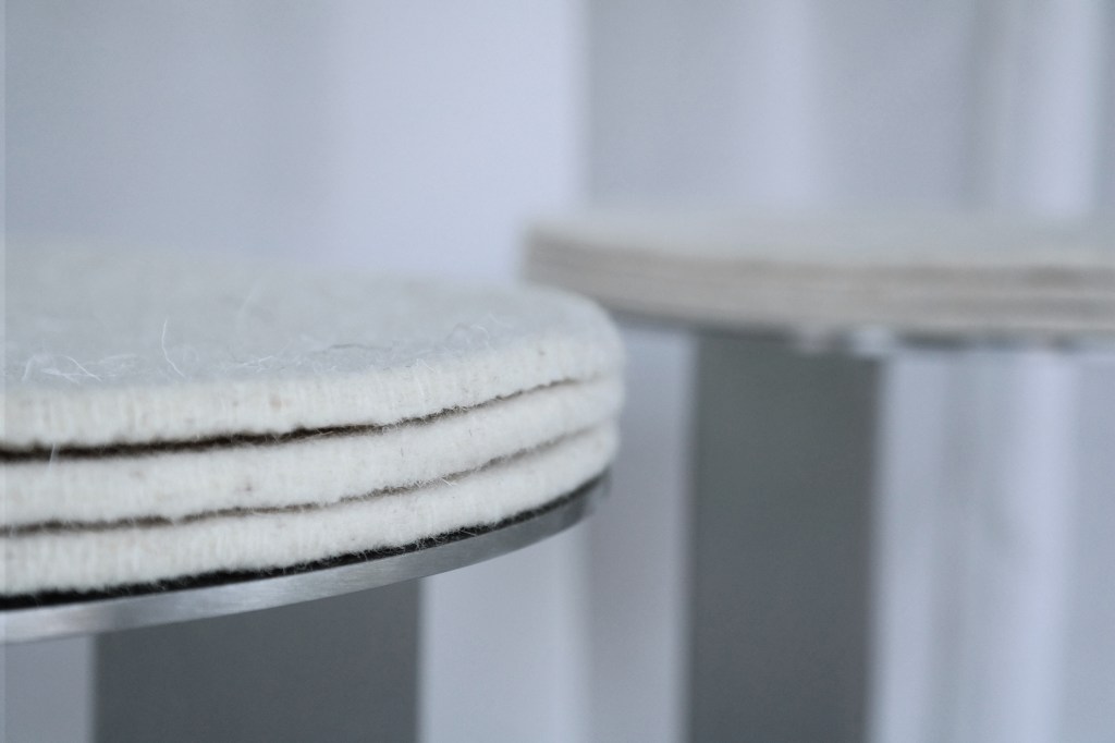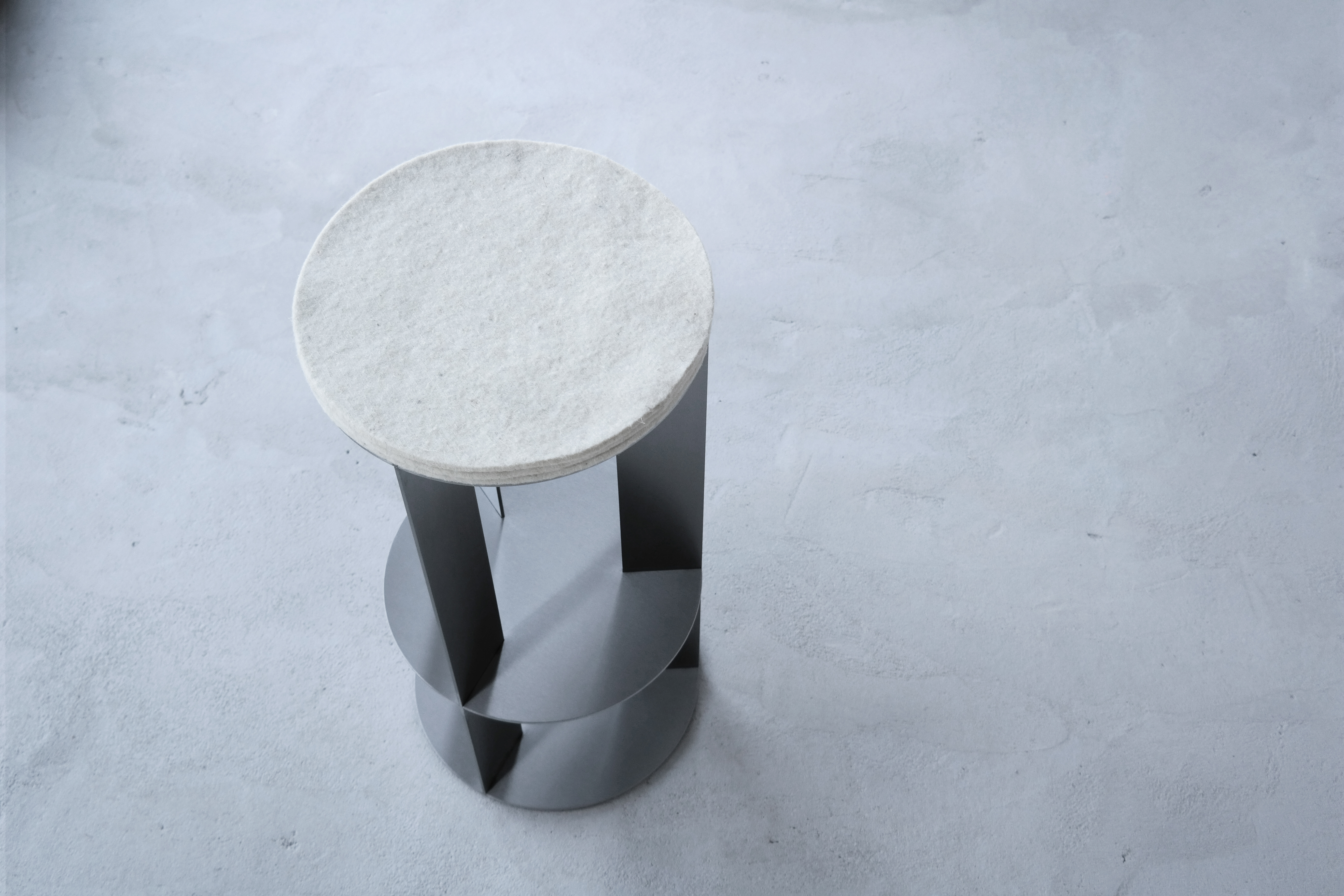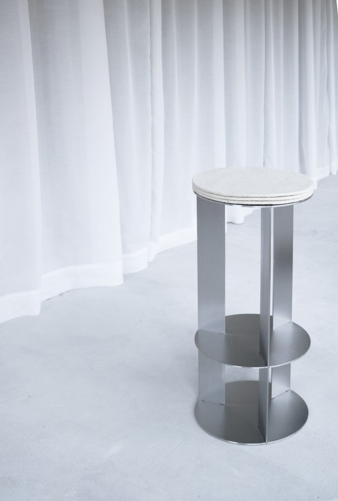 inspired by the fragility and lightness of paper, the design transforms this aesthetic onto stainless steel and wool felt, two contrasting materials that merge here in an unexpected symbiosis.